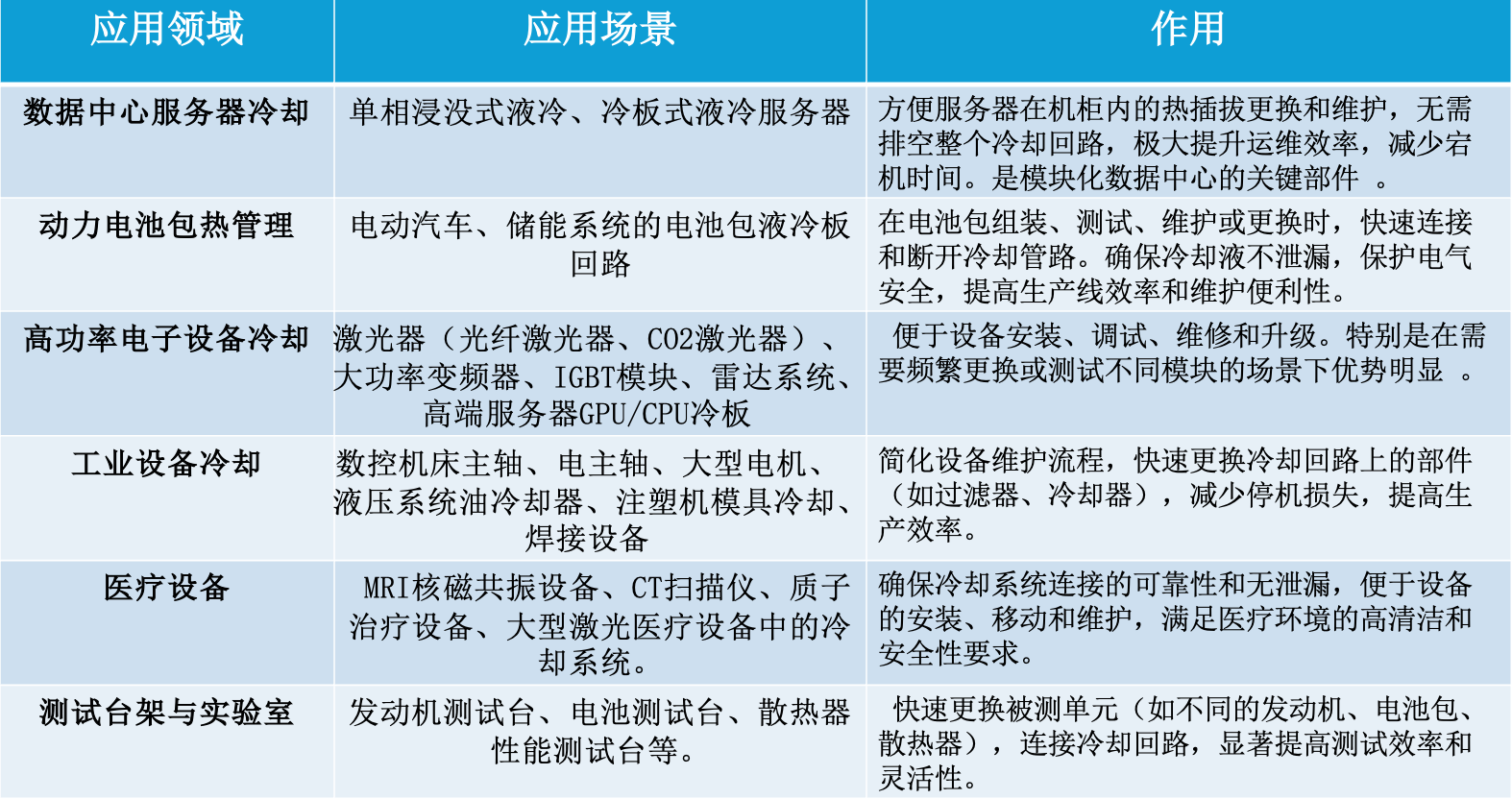 液冷快接头是液冷系统中的关键部件,主要用于实现液冷管路与设备之间的快速连接和断开,确保冷却液的安全流通和系统的便捷维护,广泛应用于需要高效、可靠液冷且经常需要维护、更换或扩展的场景:
