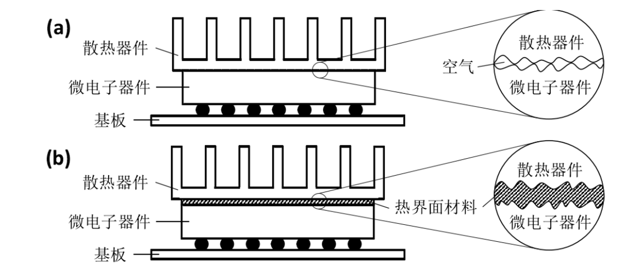 热界面材料通过填充发热设备与散热器之间微观不平坦表面的空气间隙,来消除热阻,从而提高热量从发热源到散热器的传导效率。 由于空气是热的不良导体,直接接触的实际接触面积很小,热界面材料则用高导热性的材料建立一条有效的导热通道,使散热性能得到显著提升。