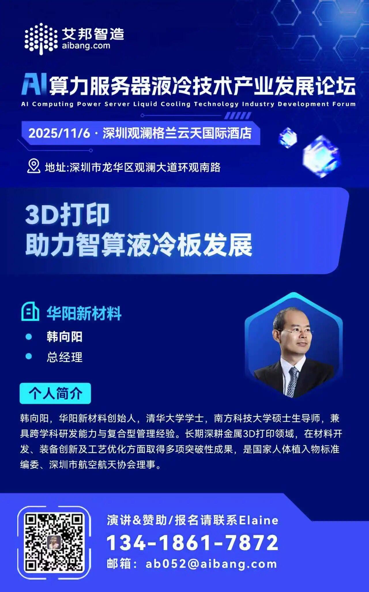 艾邦将于11月6日在深圳举办“AI算力服务器液冷技术产业发展论坛”,届时 深圳市华阳新材料科技有限公司 创始人兼董事长 韩向阳 将给大家带来《3D打印助力智算液冷板发展》主题演讲,敬请期待!