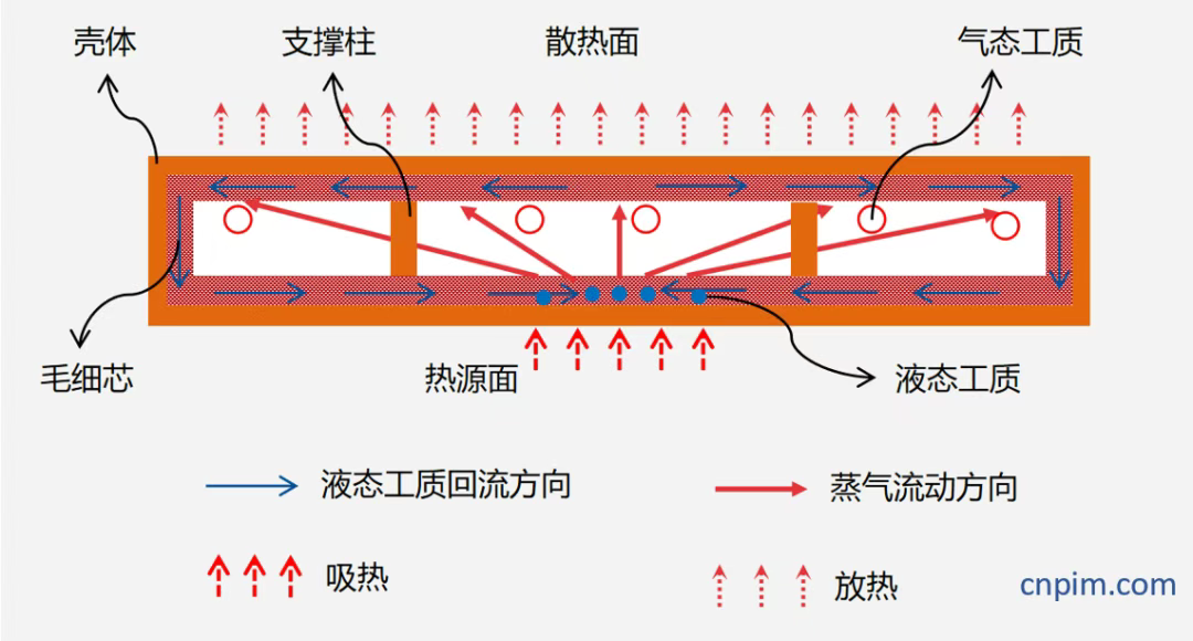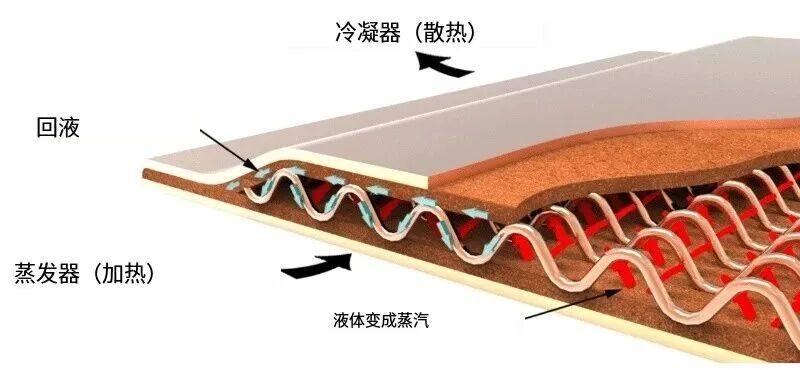 相变散热:内部的工质在受热时蒸发,然后冷凝并将热量传递到外部,通过密封腔体形成一个高效的循环散热系统。