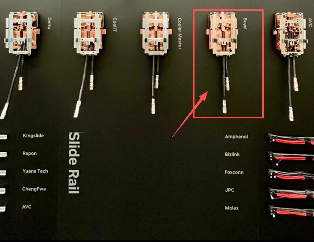 目前Boyd也是AI数据中心液冷散热产品的头部厂商,是英伟达和北美四大头部csp客户的主要供应商,主要交付冷板和CDU等产品,目前其冷板是英伟达及其服务器生态的主力供应商,目前在GB200/GB300等主流AI服务器批量应用。