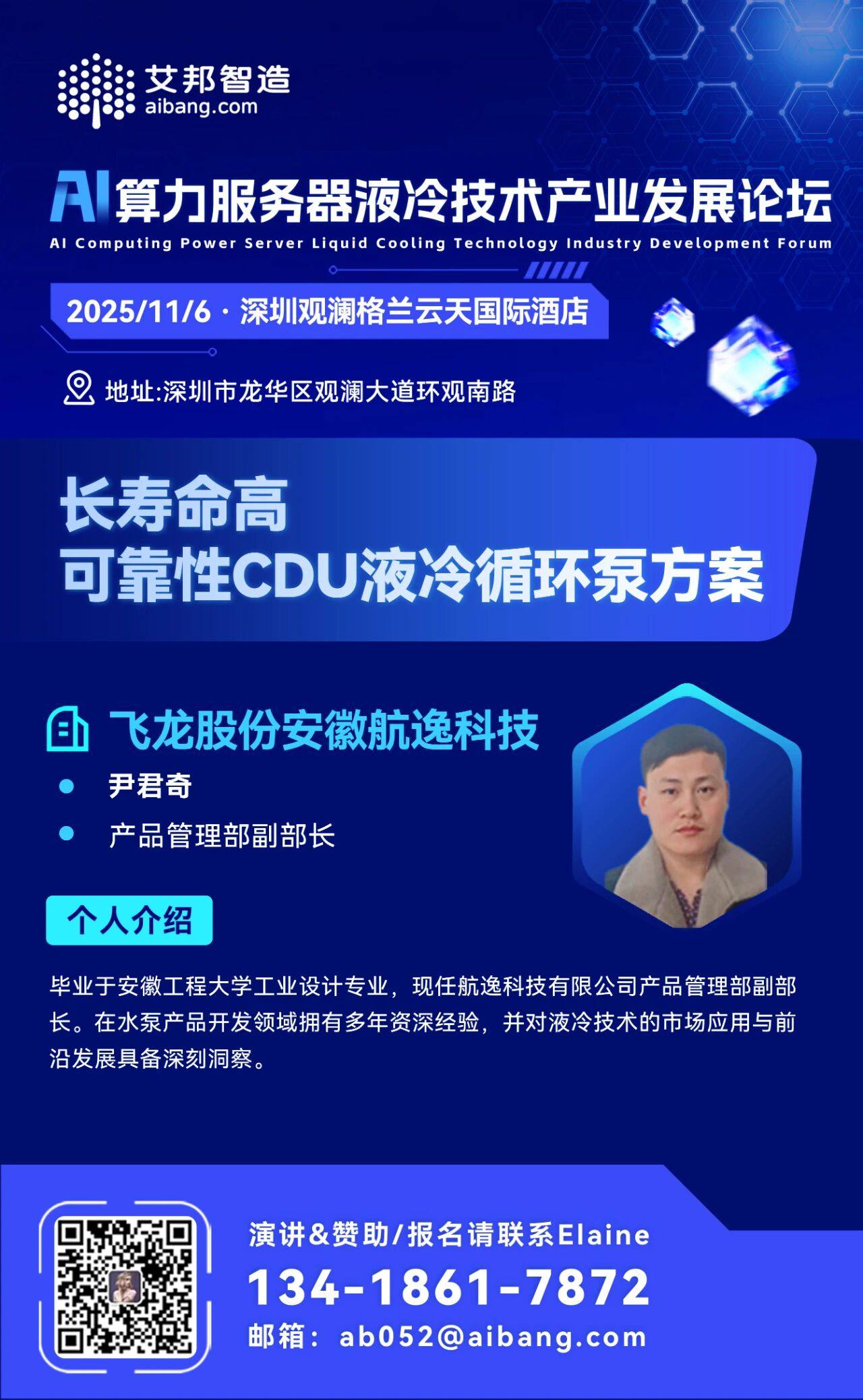 艾邦将于11月6日在深圳举办“AI算力服务器液冷技术产业发展论坛”,届时 飞龙股份安徽航逸科技有限公司 产品管理部副部长 尹君奇 将给大家带来《长寿命高可靠性CDU循环泵方案》主题演讲,敬请期待!