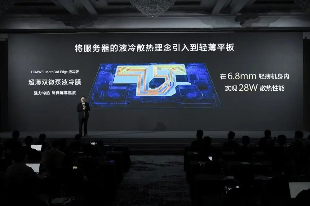 2025年11月,华为 MatePad Edge则首次在平板电脑中搭载液冷散热技术,超薄0.335mm 液冷层,搭载超精密双核微泵,配合高导热石墨烯,迅速导离屏幕热量,使得屏幕最热点温度降低了 2~3℃。