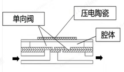 其原理是在电场作用下,压电陶瓷材料会发生拉伸/压缩形变,带动陶瓷片下面的金属片产生如下图所示的向上凸起或向下凹陷。压电振子在电场作用下,泵的腔体容积会发生变化,从而对液体产生“吸”或“压”力,并在单向阀的作用下形成液体的单向流动。而在振子上施加交流电场,流动就变成了连续的吸压流体,形成冷却液在密闭微通道内的定向循环,将热量从热源(如芯片、电池)传递至散热终端。