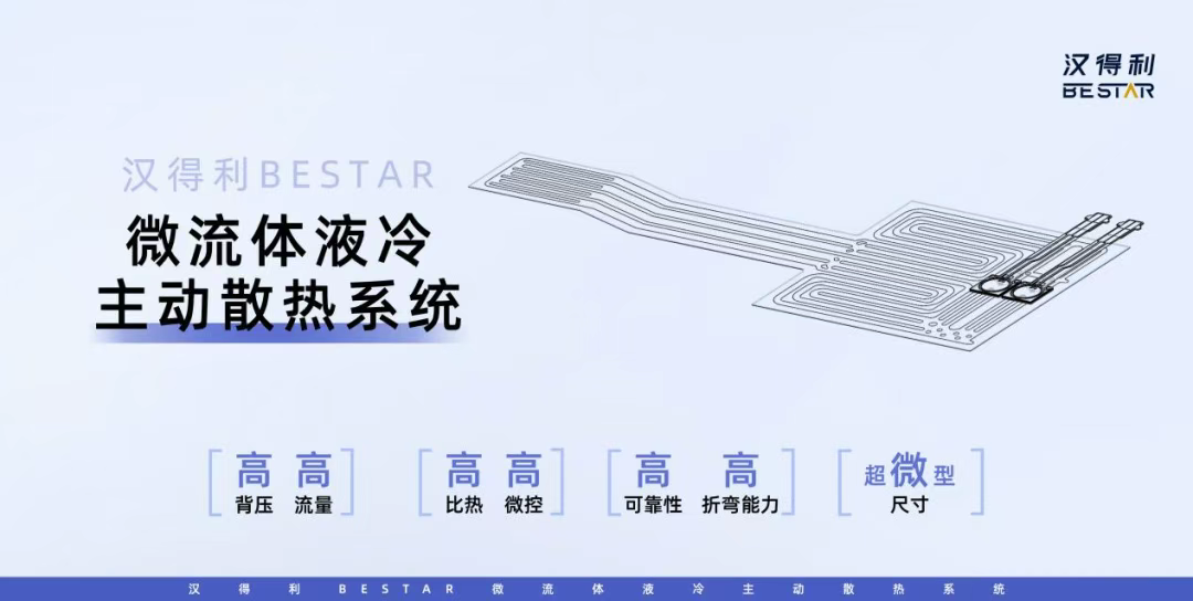 汉得利BESTAR微流体液冷主动散热系统由PZT微泵、微流道和工质组成,具备高背压、高流量、高比热、高微控、高可靠性、高折弯能力和超微型尺寸等特点,能够在短时间内显著降低热源区域温度,实现快速散热和精确温度控制。