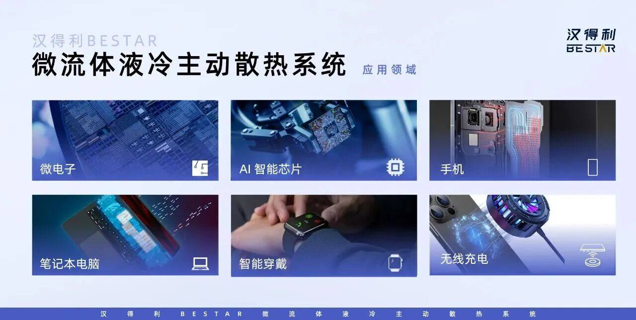 汉得利BESTAR针对手机、可穿戴设备等微型电子产品的散热瓶颈,创新研发出基于压电效应的“微流体液冷主动散热系统”与“微型压电风扇散热系统”,提供热源直触式主动散热解决方案。
