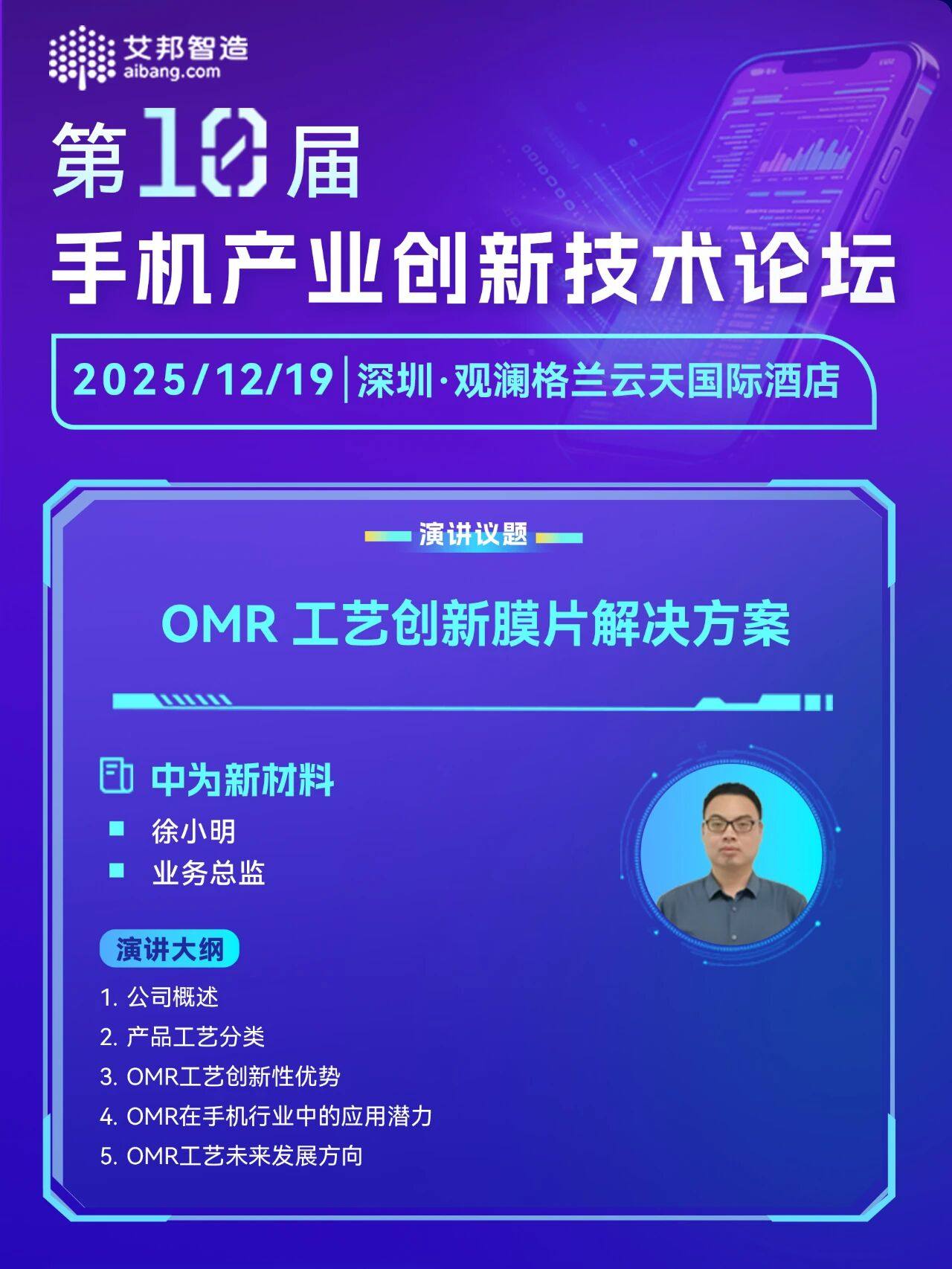 12月19日,由艾邦智造举办的第十届手机产业创新技术论坛将在深圳召开。届时,东莞市中为新材料科技有限公司 业务总监 徐小明 将作为演讲嘉宾出席,分享主题《 OMR工艺创新膜片解决方案 》,期待大家与会交流。