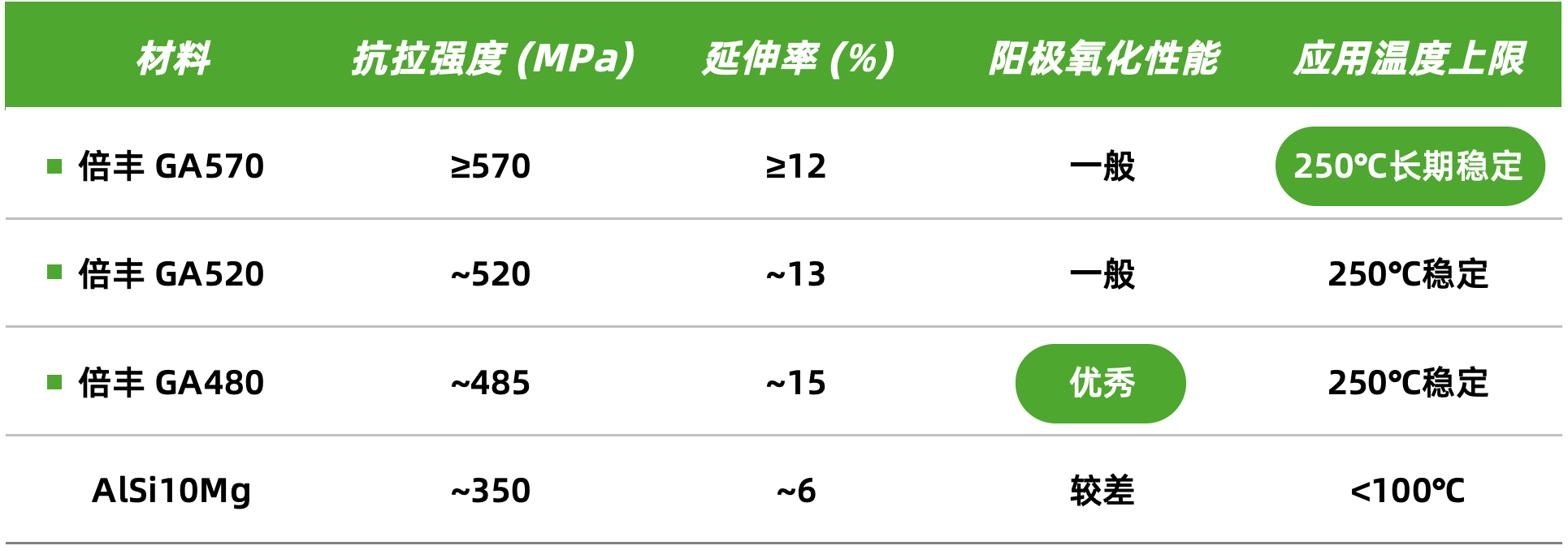 倍丰团队开发的GA570、GA520与GA480三款高强铝合金,均为增材制造专用铝合金材料,三者在250℃以内均表现出优异的热稳定性和结构强度,抗拉强度在485–570 MPa之间,延伸率达12–17%,能够满足航空航天与消费电子领域对于高温载荷结构和精密轻质件的双重需求。