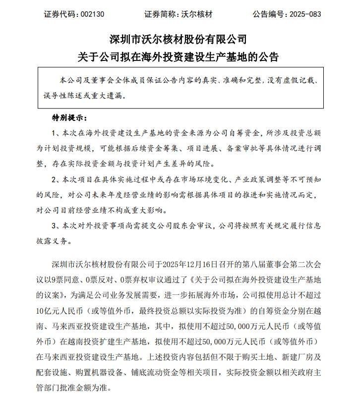 近日,沃尔核材(002130.SZ)公告称,公司拟使用总计不超过10亿元人民币的自筹资金分别在越南、马来西亚投资建设生产基地,其中,拟使用不超过5亿元人民币(或等值外币)在越南投资扩建生产基地,拟使用不超过5亿元人民币(或等值外币)在马来西亚投资建设生产基地。