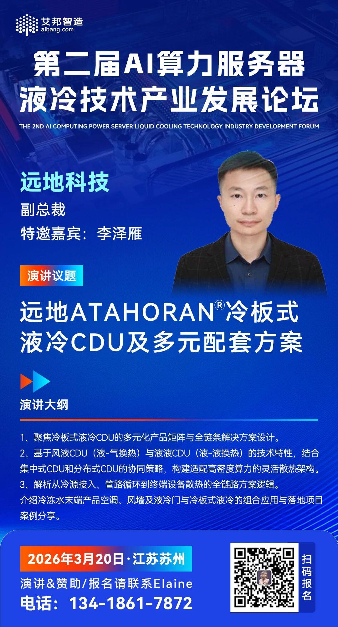 艾邦将于3月20日在苏州举办“第二届AI算力服务器液冷技术产业发展论坛”,届时 远地(广州)数字科技有限公司 副总裁 李泽雁 将给大家带来《远地ATAHORAN®️冷板式液冷CDU及多元配套方案》主题演讲,敬请期待!