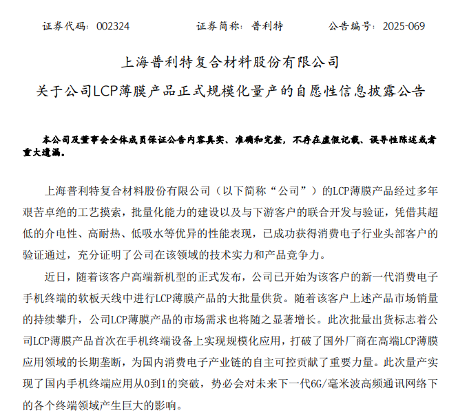普利特表示,公司LCP薄膜产品凭借超低的介电性、高耐热、低吸水等优异的性能表现,已成功获得消费电子行业头部客户的验证通过。随着该客户高端新机型的正式发布,公司已开始为其新一代消费电子手机终端的软板天线大批量供应LCP薄膜产品。随着该客户上述产品市场销量的持续攀升,公司LCP薄膜产品的市场需求也将随之显著增长。