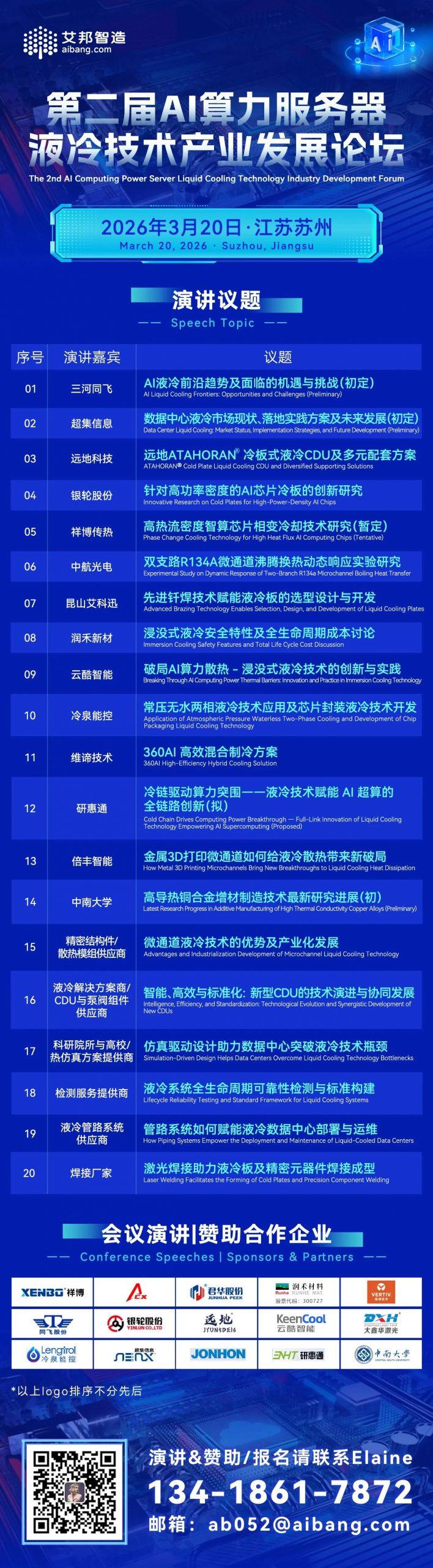 艾邦建有服务器液冷散热交流群,聚焦服务器液冷技术前沿,涵盖冷板/浸没/喷淋式方案设计、材料升级(耐腐蚀管路、密封件创新)、CDU运维与能效优化、政策标准解读(PUE、OCP规范)等。欢迎大家加入我们,共绘服务器液冷散热未来!
