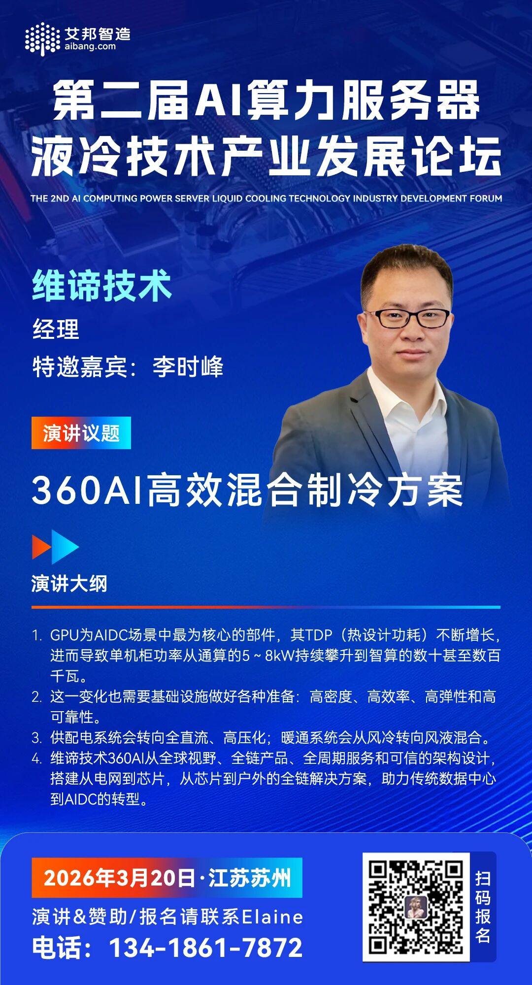 艾邦将于3月20日在苏州举办“第二届AI算力服务器液冷技术产业发展论坛”,届时 维谛技术 经理 李时峰 将给大家带来《360AI高效混合制冷方案主题演讲,敬请期待!