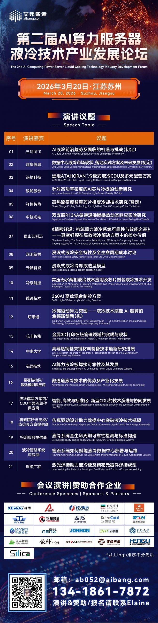 艾邦建有服务器液冷散热交流群,聚焦服务器液冷技术前沿,涵盖冷板/浸没/喷淋式方案设计、材料升级(耐腐蚀管路、密封件创新)、CDU运维与能效优化、政策标准解读(PUE、OCP规范)等。欢迎大家加入我们,共绘服务器液冷散热未来!