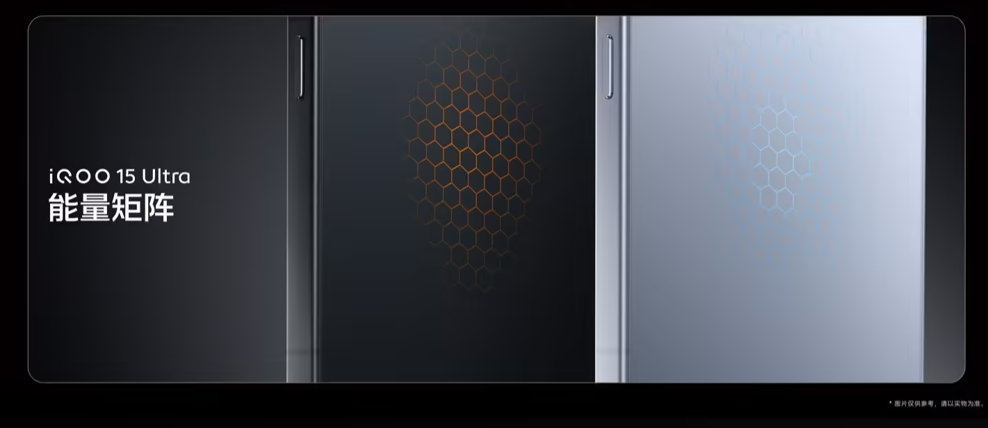 为了在纯平玻纤材质后盖上实现无源流光视效,iQOO 15 Ultra 采用全新Texture on Fiber技术,历经15层精密工艺叠加,突破性实现纤维材料上的「双纹双镀」效果,让背部的「能量矩阵」里暗藏六边形蜂巢纹理,可随角度和光线变化呈现动态流光涌动效果,彰显性能张力与未来感!