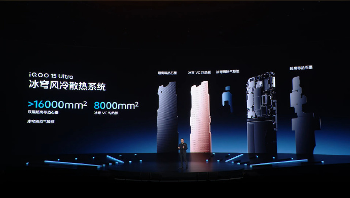 在散热方面,iQOO15 Ultra搭载主被动一体式「冰穹风冷散热系统」,通过超大风量风扇、8K 冰穹 VC 均热板、超高导热石墨层及冰穹隔热气凝胶等主被动配合,实现高效散热与隔热手感。同时采用隐藏式进风口与双防尘网设计,有效阻挡沙尘进入。