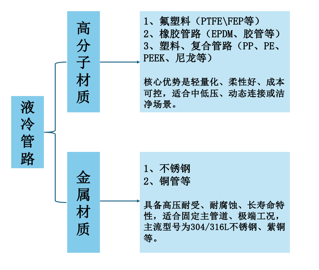 根据应用场景和工况的不同,液冷管路主要分为两大类:高分子材料管路和金属管路,它们各自在系统中扮演着不同的角色。