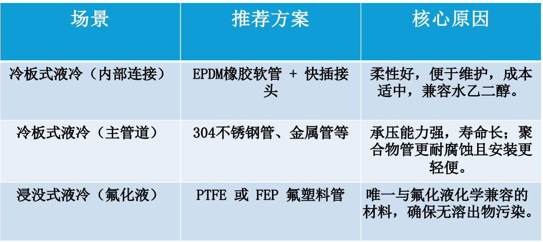 - 特点:耐温范围-40℃~150℃,兼容水乙二醇、丙二醇等常规冷却液,成本低、柔性极佳,适合服务器冷板式液冷内部连接。