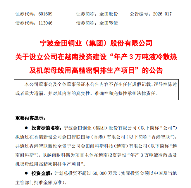 3月31日,金田股份(601609)发布公告,公司拟通过在香港新设公司金田智联国际(香港)有限公司,并通过香港智联新设全资子公司金田耐科斯科技(越南)有限公司,以越南耐科斯为项目主体在越南投资建设“年产3万吨液冷散热及机架母线用高精密铜排生产项目”。