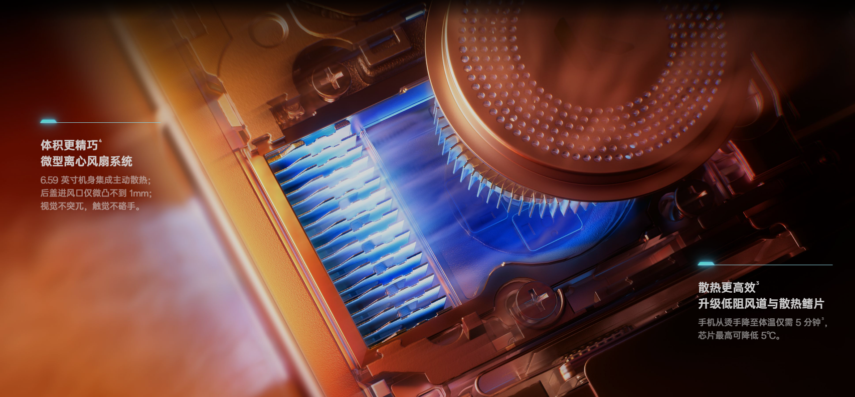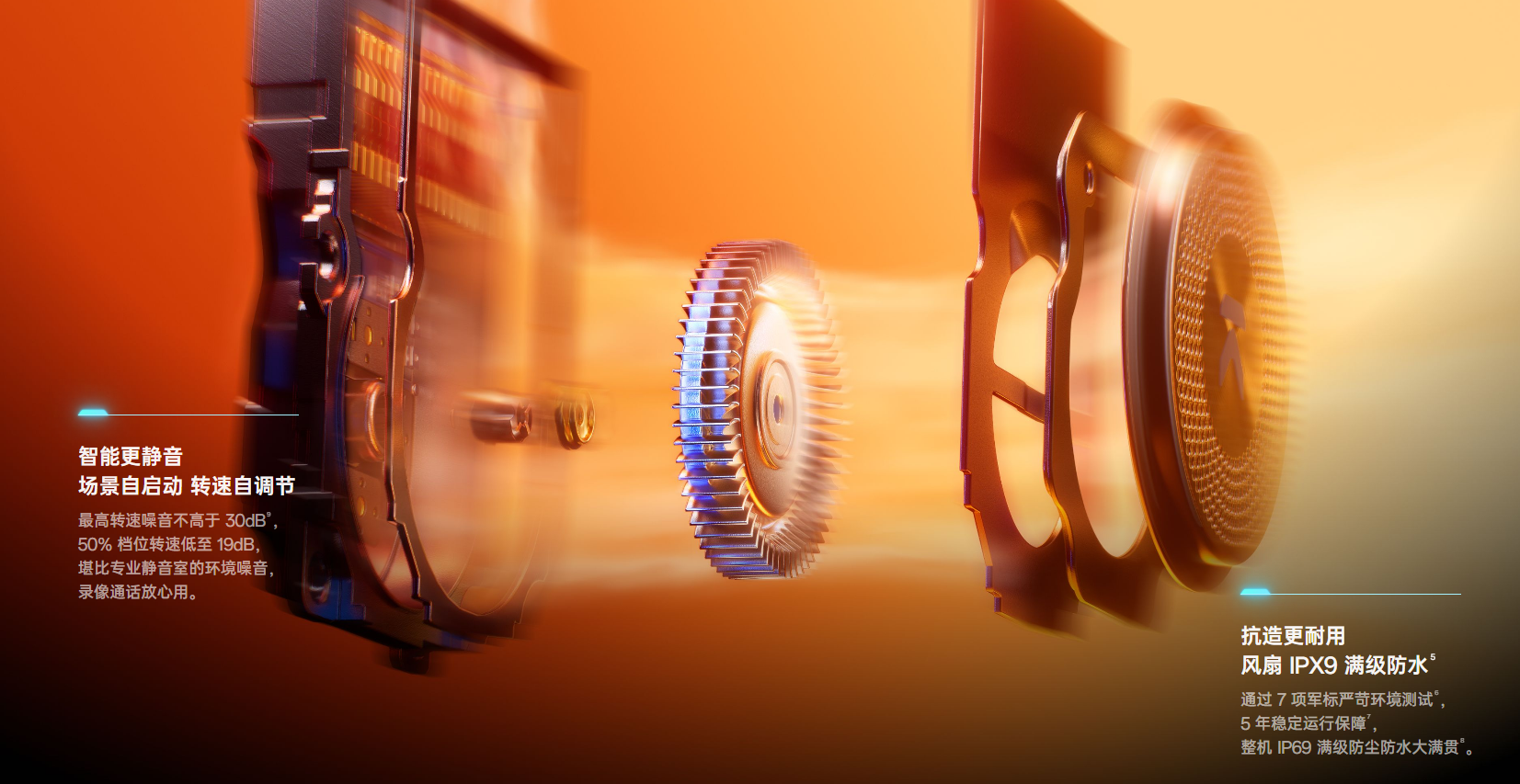 OPPO K15 Pro的新一代疾风散热引擎,配备体积更精巧的微型离心风扇系统,在6.59 英寸小尺寸机身中集成主动散热;后盖进风口仅微凸不到 1mm,视觉不突兀,触觉不硌手。升级低阻风道与散热鳍片,散热更高效;手机从烫手降至体温仅需 5分钟,芯片最高可降低 5℃。三重防尘强化设计,整机通过IP69满级防尘防水测试,抗造更耐用。支持智能自启动与转速自调节,50%转速下主观听感噪音仅19dB,智能更静音。