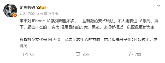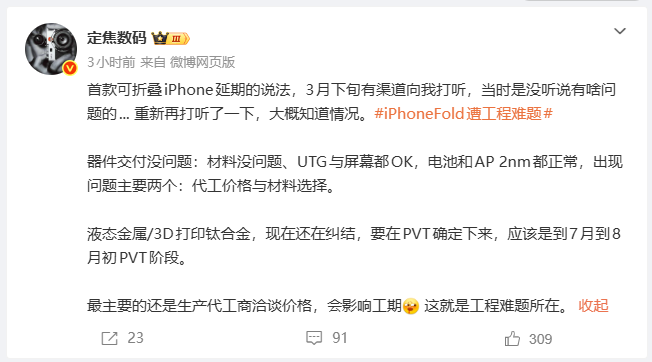 • 4月7日,@定焦数码发布博文表示,iPhone Fold的器件交付没问题,目前面临的工程难题主要是代工价格与材料选择。材料方面还在纠结液态金属/3D打印钛合金,应该是到7月到8月初PVT阶段确定下来;而生产代工商洽谈价格,也会影响工期。